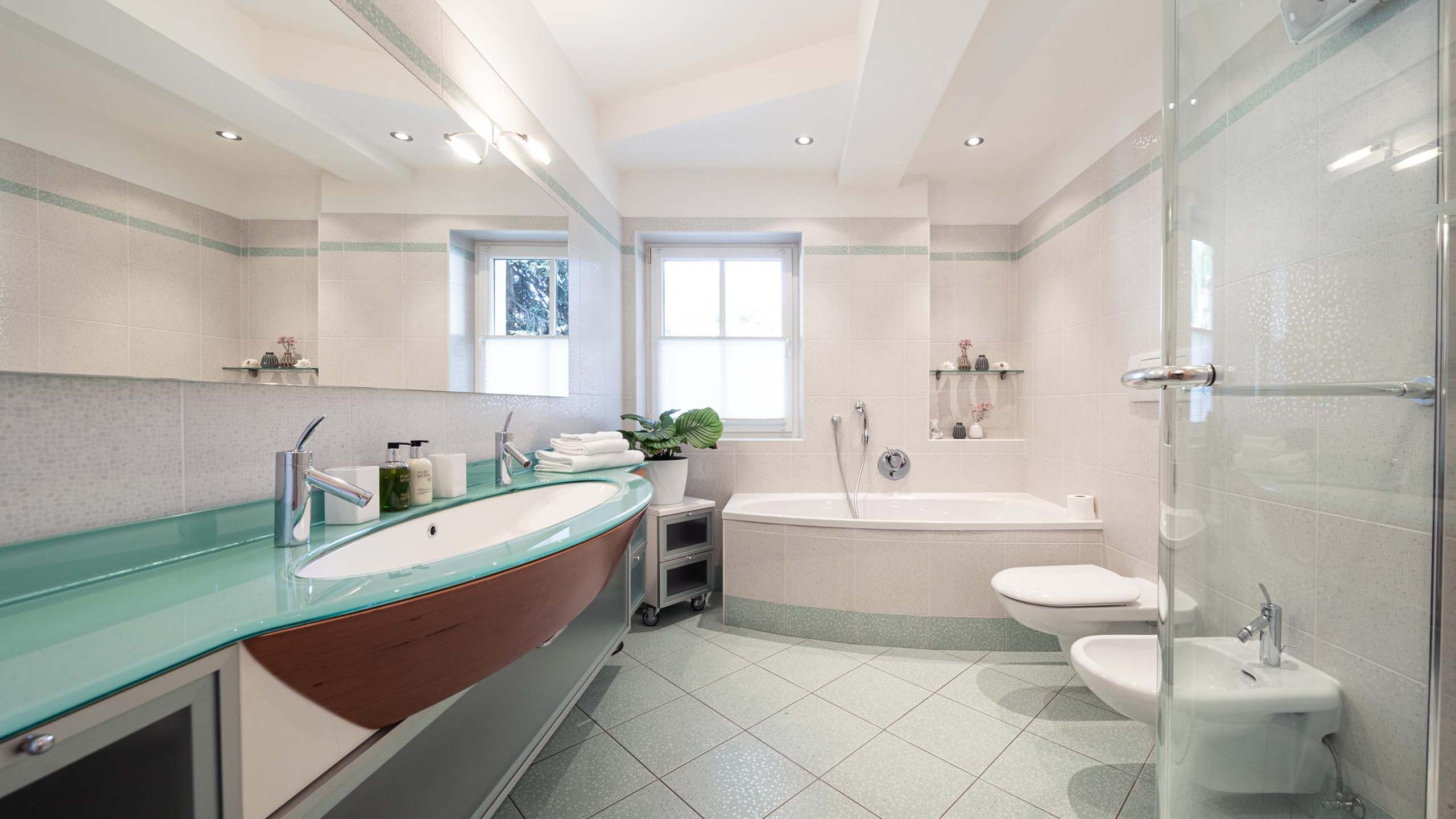 - Family bathroom with double washbasin, bathtub, shower, toilet, bidet, and hairdryer