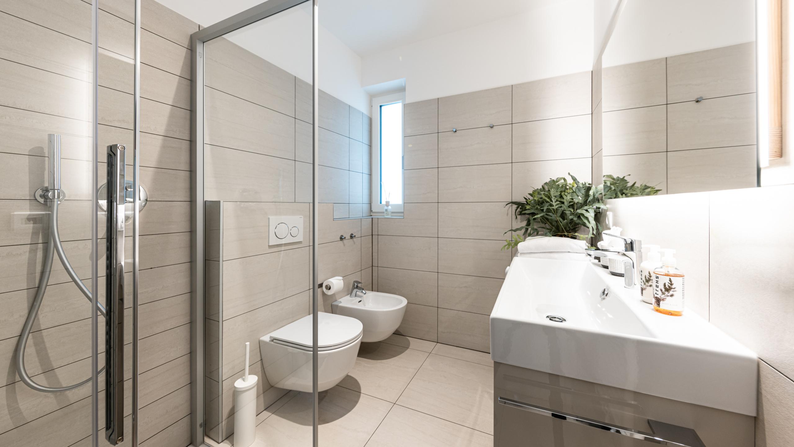 - Bathroom with shower, toilet, bidet, and hairdryer